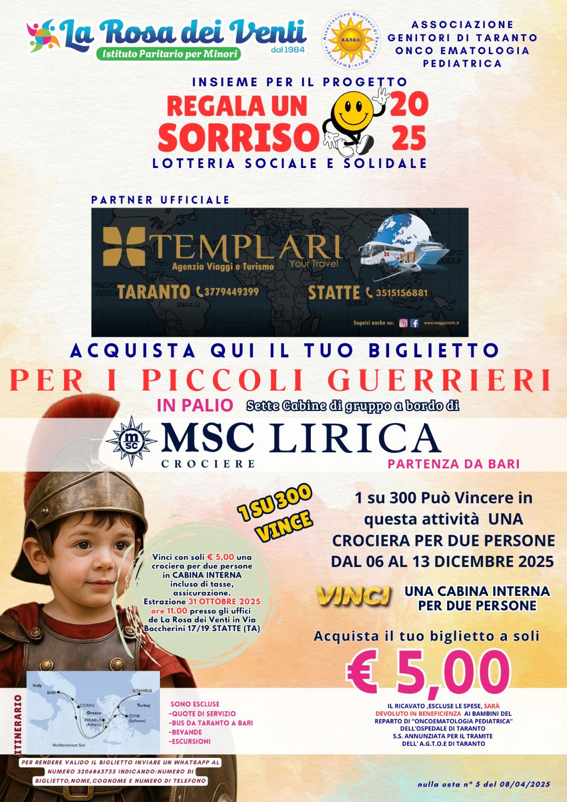 Il ricavato, tolto le spese, sarà devoluto in beneficienza ai bambini del reparto “oncoematologia pediatrica” dell’ospedale di Taranto S.S. Annunziata per il tramite dell’A.G.T.O.E. di Taranto