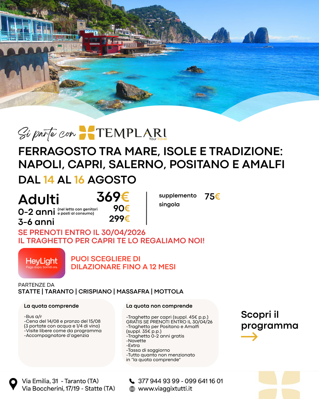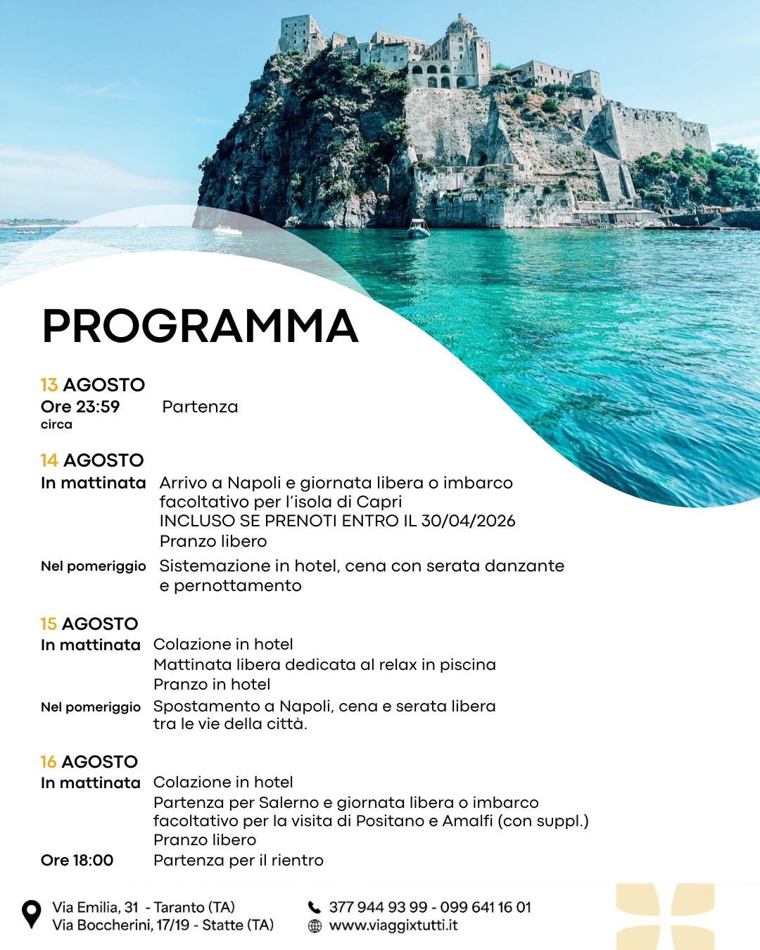 - Traghetto per Capri (suppl. 45€ p.p.) GRATIS SE PRENOTI ENTRO IL 30/04/2026;