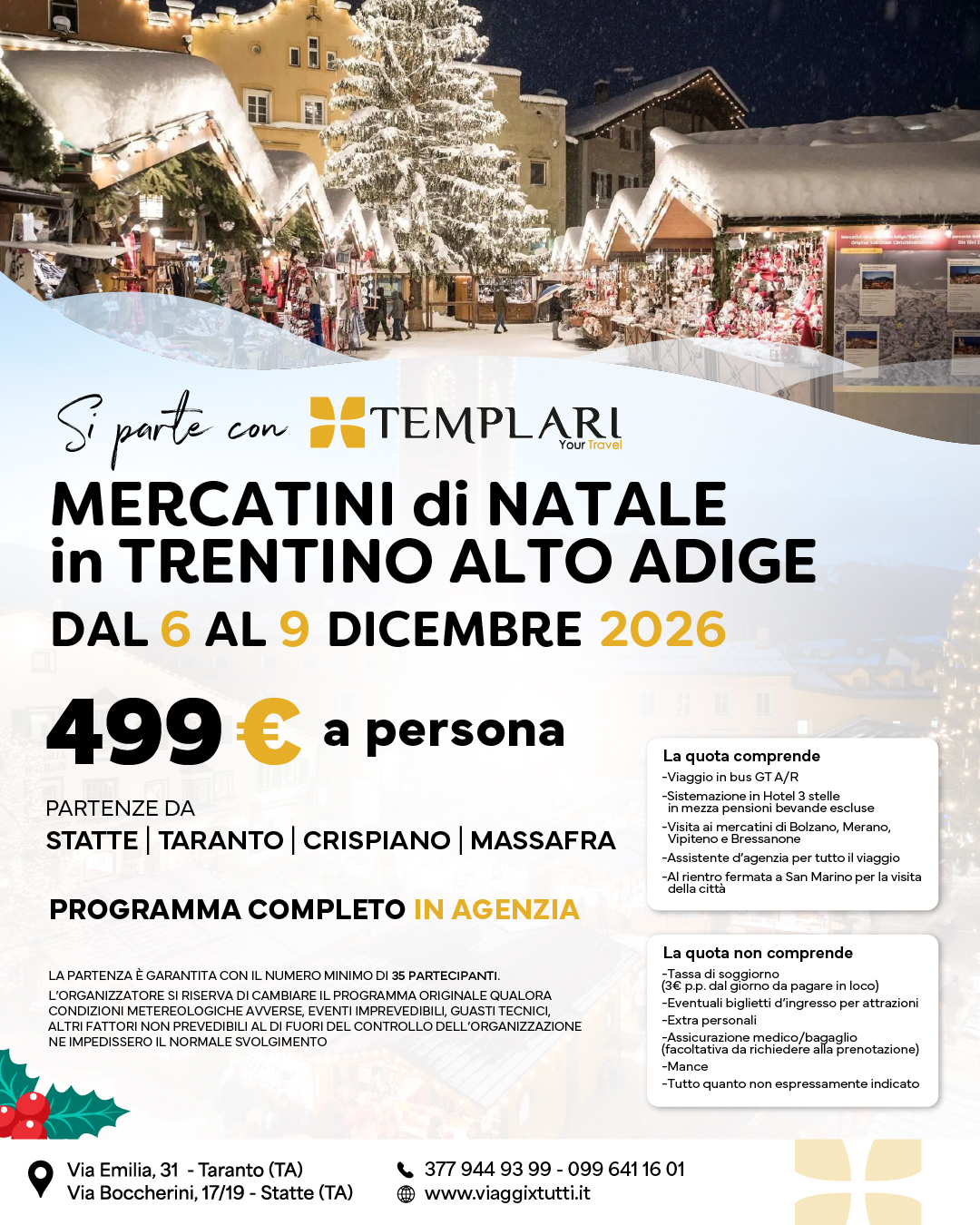 - Nel pomeriggio partenza per il rientro a Taranto.