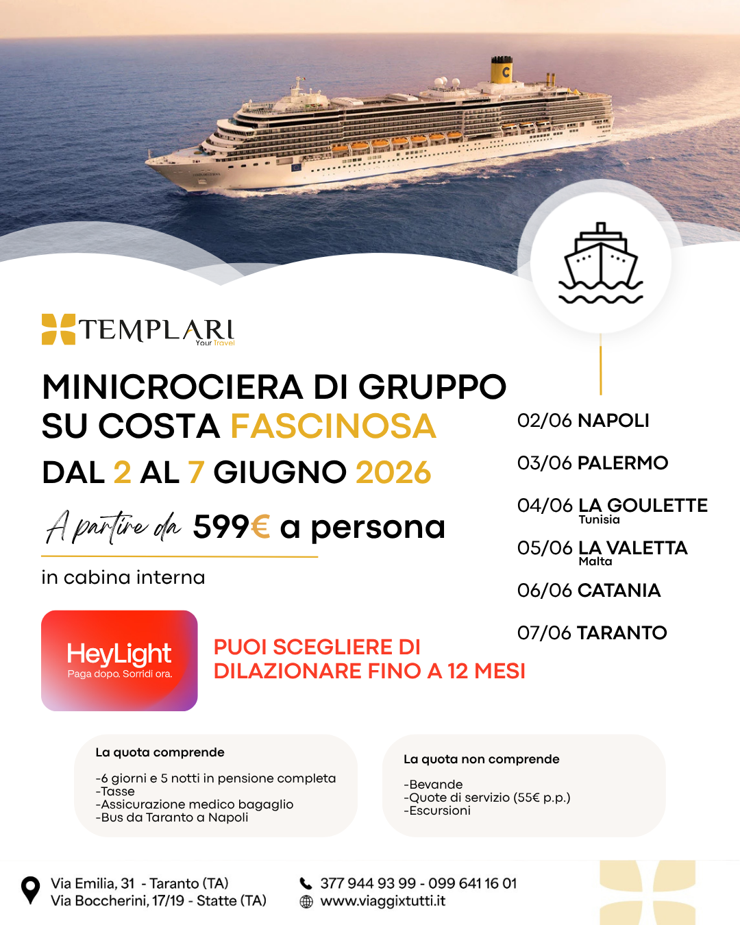- COSTO A PERSONA IN CABINA DOPPIA INTERNA: € 599,00