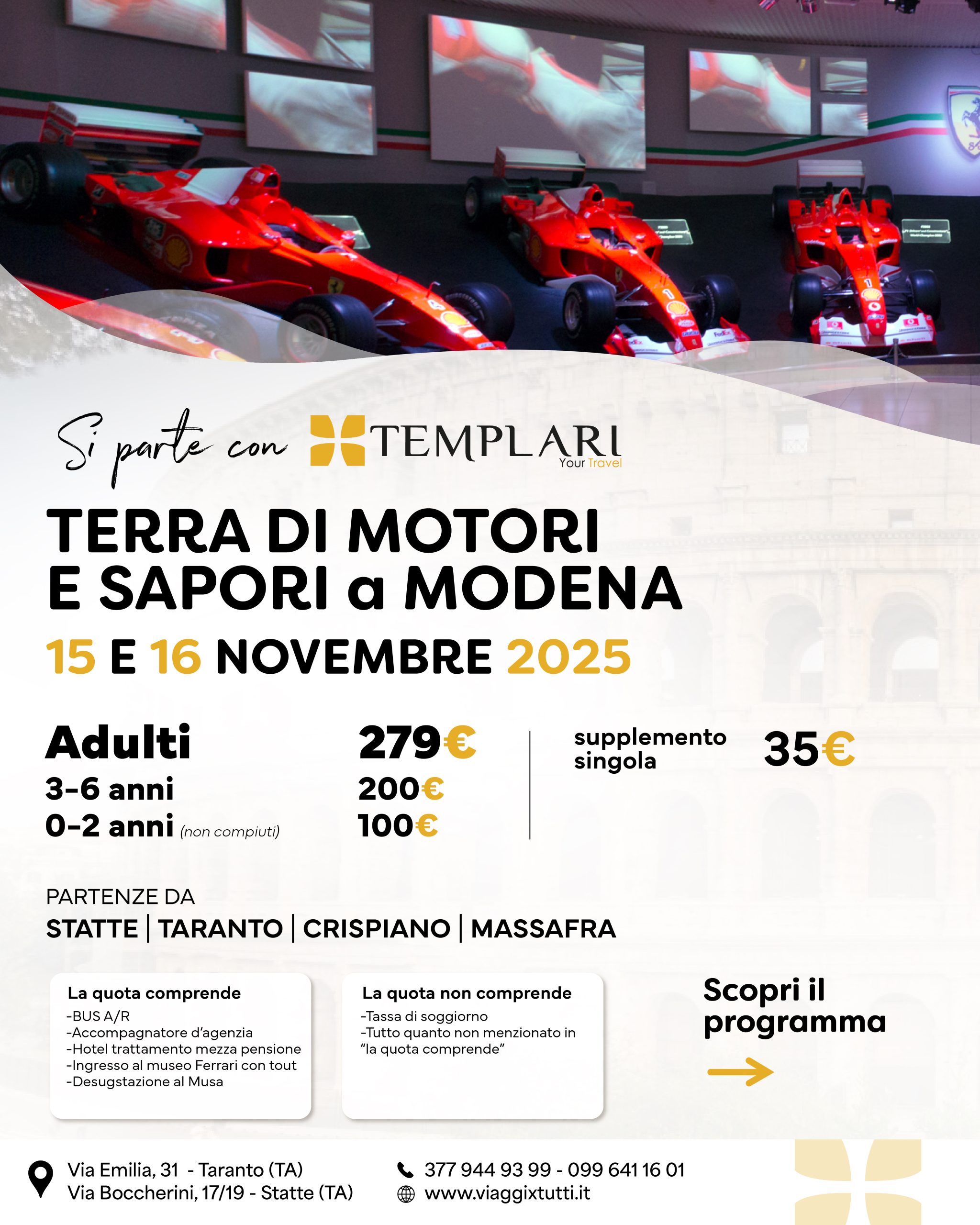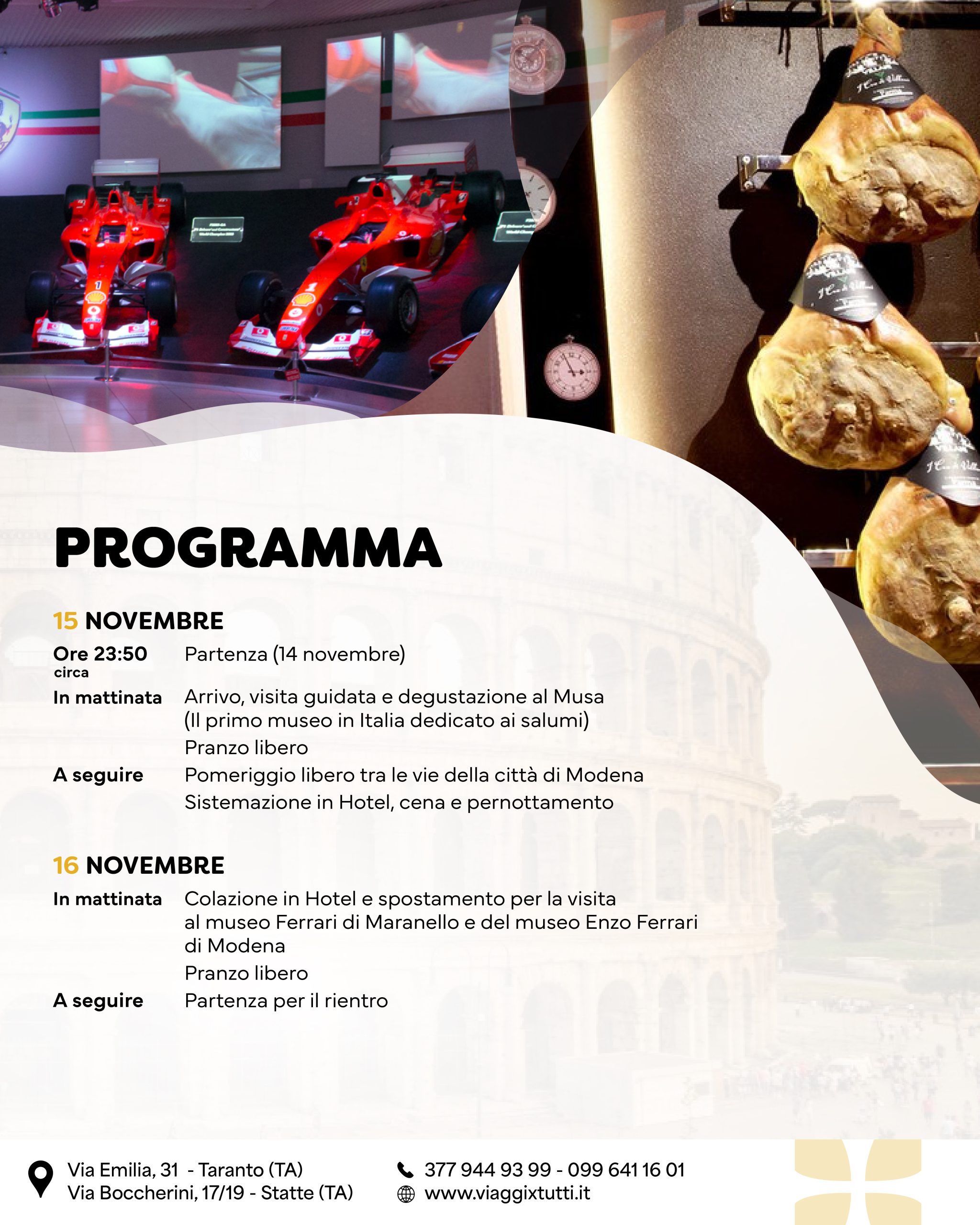 • Pomeriggio libero tra le vie della città di Modena per lo shopping;
