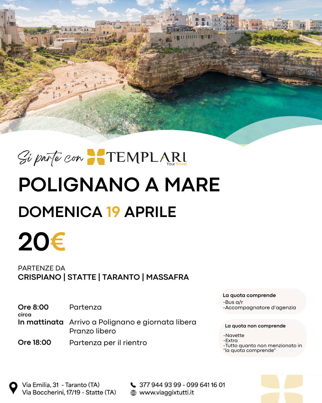 - In mattinata arrivo a Polignano a Mare e giornata libera;