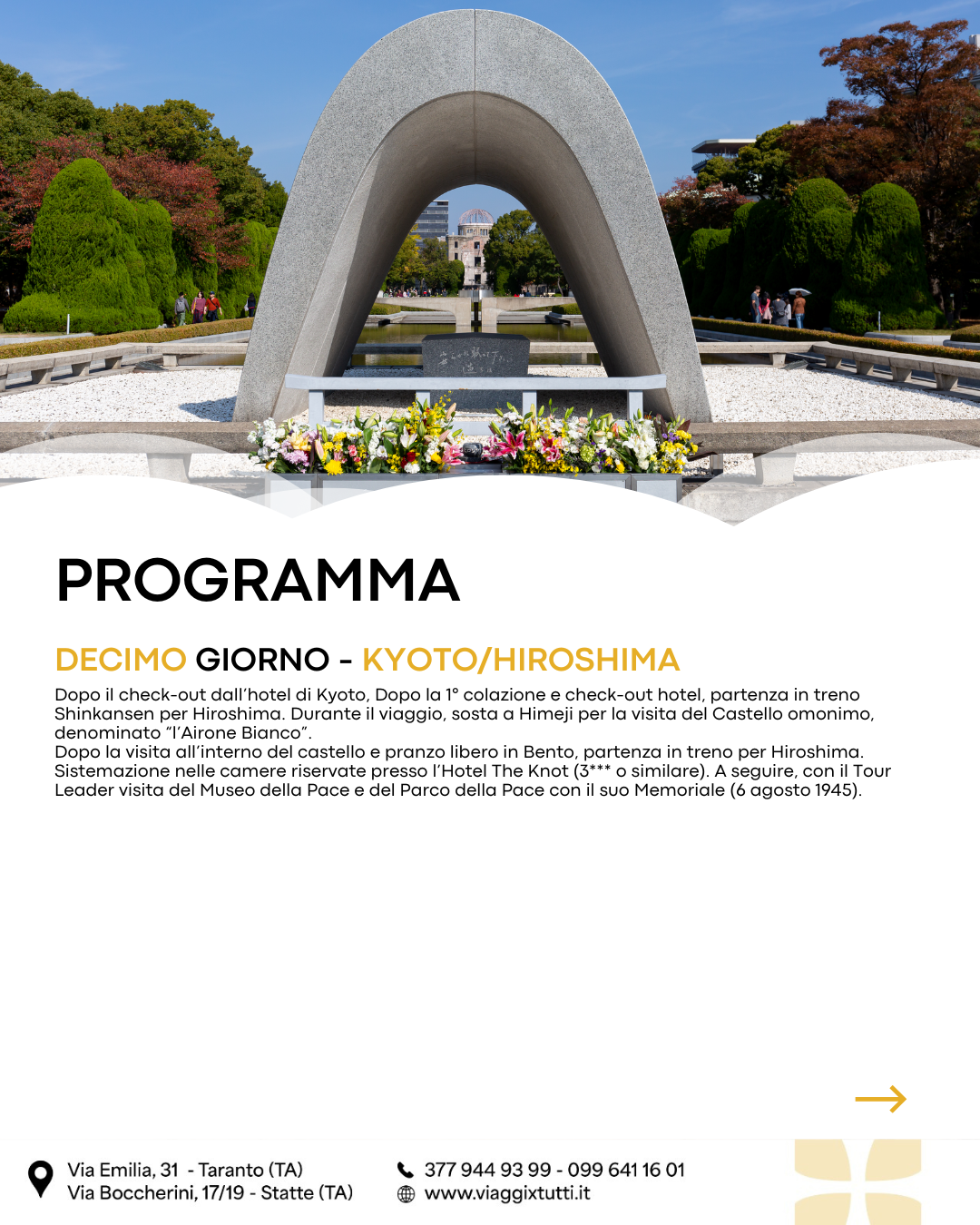 Dopo il check-out dall’hotel di Kyoto, Dopo la 1° colazione e check-out hotel, partenza in treno Shinkansen per Hiroshima. Durante il viaggio, sosta a Himeji per la visita del Castello omonimo, denominato “l’Airone Bianco”. Dopo la visita all’interno del castello e pranzo libero in Bento, partenza in treno per Hiroshima. Sistemazione nelle camere riservate presso l’Hotel The Knot (3*** o similare). A seguire, con il Tour Leader visita del Museo della Pace e del Parco della Pace con il suo Memoriale (6 agosto 1945).