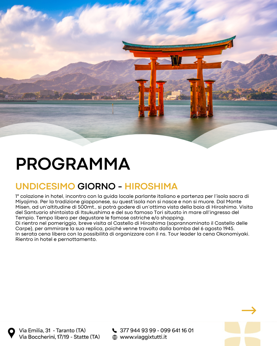 1° colazione in hotel, incontro con la guida locale parlante italiano e partenza per l’isola sacra di Miyajima. Per la tradizione giapponese, su quest’isola non si nasce e non si muore. Dal Monte Misen, ad un’altitudine di 500mt., si potrà godere di un’ottima vista della baia di Hiroshima. Visita del Santuario shintoista di Itsukushima e del suo famoso Tori situato in mare all’ingresso del Tempio. Tempo libero per degustare le famose ostriche e/o shopping. Di rientro nel pomeriggio, breve visita al Castello di Hiroshima (soprannominato il Castello delle Carpe), per ammirare la sua replica, poiché venne travolto dalla bomba del 6 agosto 1945. In serata cena libera con la possibilità di organizzare con il ns. Tour leader la cena Okonomiyaki. Rientro in hotel e pernottamento.