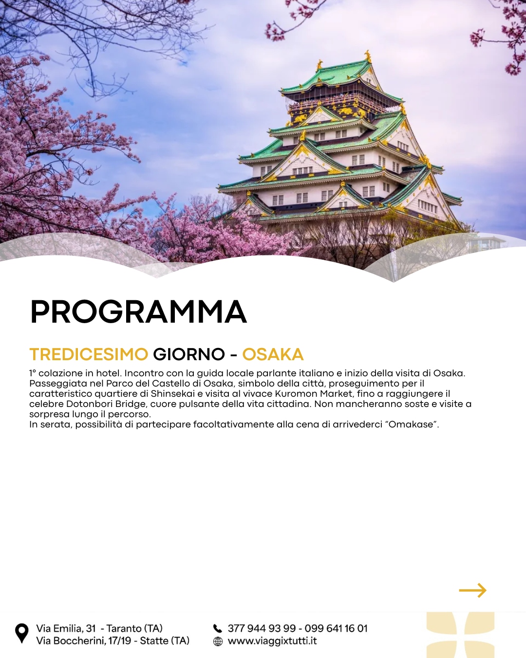 1° colazione in hotel. Incontro con la guida locale parlante italiano e inizio della visita di Osaka.Passeggiata nel Parco del Castello di Osaka, simbolo della città, proseguimento per il caratteristico quartiere di Shinsekai e visita al vivace Kuromon Market, fino a raggiungere il celebre Dotonbori Bridge, cuore pulsante della vita cittadina. Non mancheranno soste e visite a sorpresa lungo il percorso. In serata, possibilità di partecipare facoltativamente alla cena di arrivederci “Omakase”.
