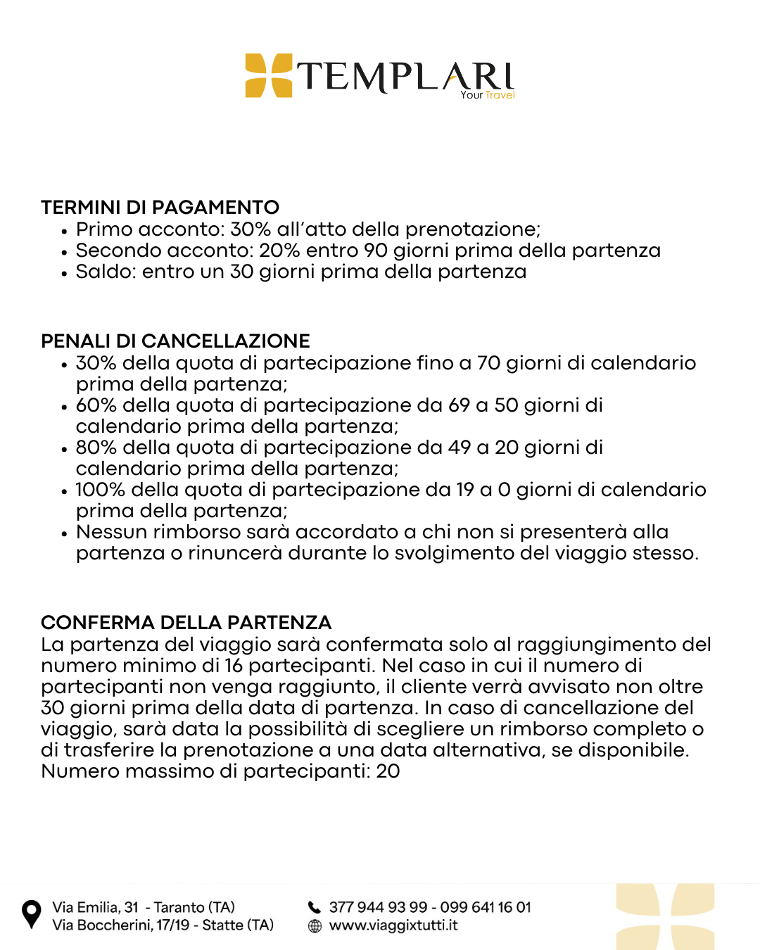 La partenza del viaggio sarà confermata solo al raggiungimento del numero minimo di 16 partecipanti. Nel caso in cui il numero di partecipanti non venga raggiunto, il cliente verrà avvisato non oltre 30 giorni prima della data di partenza. In caso di cancellazione del viaggio, sarà data la possibilità di scegliere un rimborso completo o di trasferire la prenotazione a una data alternativa, se disponibile.