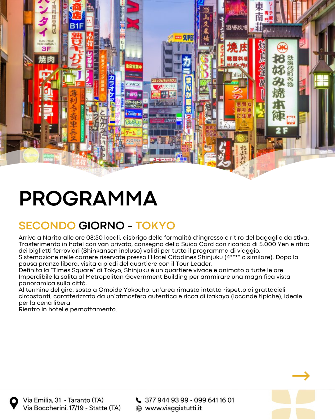 Arrivo a Narita alle ore 08:50 locali, disbrigo delle formalità d’ingresso e ritiro del bagaglio da stiva. Trasferimento in hotel con van privato, consegna della Suica Card con ricarica di 5.000 Yen e ritiro dei biglietti ferroviari (Shinkansen incluso) validi per tutto il programma di viaggio. Sistemazione nelle camere riservate presso l’Hotel Citadines Shinjuku (4**** o similare). Dopo la pausa pranzo libera, visita a piedi del quartiere con il Tour Leader. Definita la “Times Square” di Tokyo, Shinjuku è un quartiere vivace e animato a tutte le ore. Imperdibile la salita al Metropolitan Government Building per ammirare una magnifica vista panoramica sulla città. Al termine del giro, sosta a Omoide Yokocho, un’area rimasta intatta rispetto ai grattacieli circostanti, caratterizzata da un’atmosfera autentica e ricca di izakaya (locande tipiche), ideale per la cena libera. Rientro in hotel e pernottamento.