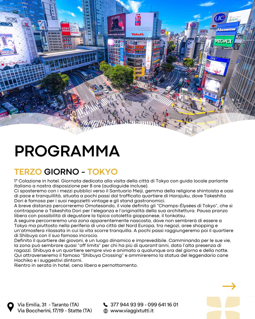 1° Colazione in hotel. Giornata dedicata alla visita della città di Tokyo con guida locale parlante italiano a nostra disposizione per 8 ore (audioguide incluse). Ci sposteremo con i mezzi pubblici verso il Santuario Meiji, gemma della religione shintoista e oasi di pace e tranquillità, situata a pochi passi dal trafficato quartiere di Harajuku, dove Takeshita Dori è famosa per i suoi negozietti vintage e gli stand gastronomici. A breve distanza percorreremo Omotesando, il viale definito gli “Champs-Élysées di Tokyo”, che si contrappone a Takeshita Dori per l’eleganza e l’originalità della sua architettura. Pausa pranzo libera con possibilità di degustare la tipica cotoletta giapponese, il tonkatsu. A seguire percorreremo una zona apparentemente nascosta, dove non sembrerà di essere a Tokyo ma piuttosto nella periferia di una città del Nord Europa, tra negozi, aree shopping e un’atmosfera rilassata in cui la vita scorre tranquilla. A pochi passi raggiungeremo poi il quartiere di Shibuya con il suo famoso incrocio. Definito il quartiere dei giovani, è un luogo dinamico e imprevedibile. Camminando per le sue vie, la zona può sembrare quasi “off limits” per chi ha più di quarant’anni, data l’alta presenza di ragazzi. Shibuya è un quartiere sempre vivo e animato a qualunque ora del giorno e della notte. Qui attraverseremo il famoso “Shibuya Crossing” e ammireremo la statua del leggendario cane Hachiko e i suggestivi dintorni. Rientro in serata in hotel, cena libera e pernottamento.
