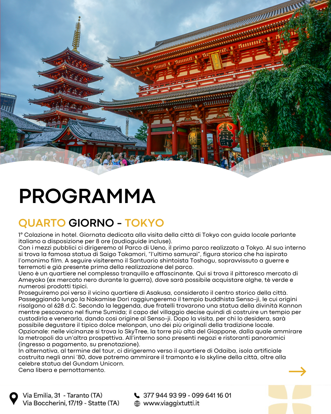 1° Colazione in hotel. Giornata dedicata alla visita della città di Tokyo con guida locale parlante italiano a disposizione per 8 ore (audioguide incluse). Con i mezzi pubblici ci dirigeremo al Parco di Ueno, il primo parco realizzato a Tokyo. Al suo interno si trova la famosa statua di Saigo Takamori, “l’ultimo samurai”, figura storica che ha ispirato l’omonimo film. A seguire visiteremo il Santuario shintoista Toshogu, sopravvissuto a guerre e terremoti e già presente prima della realizzazione del parco. Ueno è un quartiere nel complesso tranquillo e affascinante. Qui si trova il pittoresco mercato di Ameyoko (ex mercato nero durante la guerra), dove sarà possibile acquistare alghe, tè verde e numerosi prodotti tipici. Proseguiremo poi verso il vicino quartiere di Asakusa, considerato il centro storico della città. Passeggiando lungo la Nakamise Dori raggiungeremo il tempio buddhista Senso-ji, le cui origini risalgono al 628 d.C. Secondo la leggenda, due fratelli trovarono una statua della divinità Kannon mentre pescavano nel fiume Sumida; il capo del villaggio decise quindi di costruire un tempio per custodirla e venerarla, dando così origine al Senso-ji. Dopo la visita, per chi lo desidera, sarà possibile degustare il tipico dolce melonpan, uno dei più originali della tradizione locale. Opzionale: nelle vicinanze si trova lo SkyTree, la torre più alta del Giappone, dalla quale ammirare la metropoli da un’altra prospettiva. All’interno sono presenti negozi e ristoranti panoramici (ingresso a pagamento, su prenotazione). In alternativa, al termine del tour, ci dirigeremo verso il quartiere di Odaiba, isola artificiale costruita negli anni ’80, dove potremo ammirare il tramonto e lo skyline della città, oltre alla celebre statua del Gundam Unicorn. Cena libera e pernottamento.