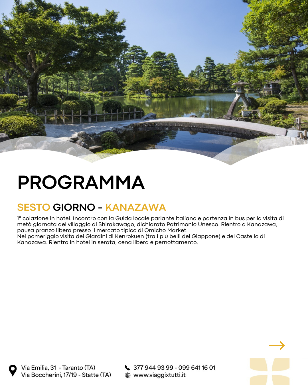 1° colazione in hotel. Incontro con la Guida locale parlante italiano e partenza in bus per la visita di metà giornata del villaggio di Shirakawago, dichiarato Patrimonio Unesco. Rientro a Kanazawa, pausa pranzo libera presso il mercato tipico di Omicho Market. Nel pomeriggio visita dei Giardini di Kenrokuen (tra i più belli del Giappone) e del Castello di Kanazawa. Rientro in hotel in serata, cena libera e pernottamento.