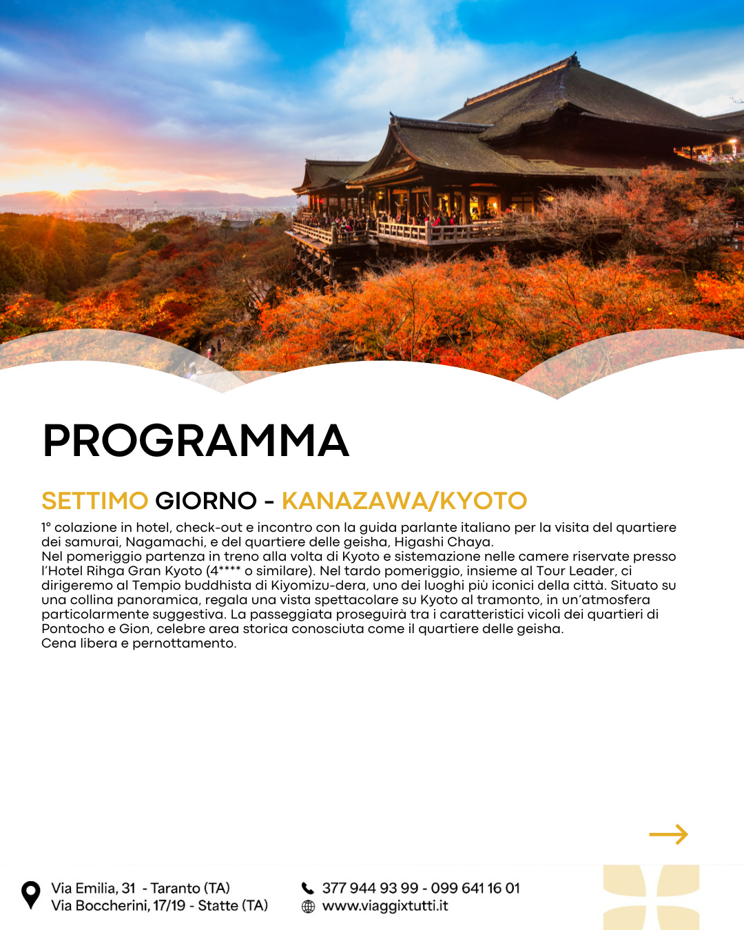 1° colazione in hotel, check-out e incontro con la guida parlante italiano per la visita del quartiere dei samurai, Nagamachi, e del quartiere delle geisha, Higashi Chaya. Nel pomeriggio partenza in treno alla volta di Kyoto e sistemazione nelle camere riservate presso l’Hotel Rihga Gran Kyoto (4**** o similare). Nel tardo pomeriggio, insieme al Tour Leader, ci dirigeremo al Tempio buddhista di Kiyomizu-dera, uno dei luoghi più iconici della città. Situato su una collina panoramica, regala una vista spettacolare su Kyoto al tramonto, in un’atmosfera particolarmente suggestiva. La passeggiata proseguirà tra i caratteristici vicoli dei quartieri di Pontocho e Gion, celebre area storica conosciuta come il quartiere delle geisha. Cena libera e pernottamento.