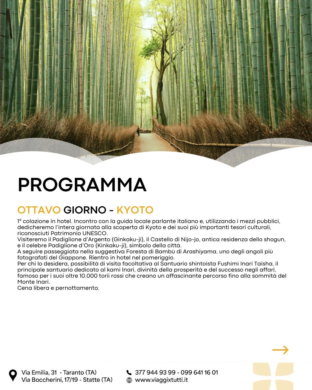 1° colazione in hotel. Incontro con la guida locale parlante italiano e, utilizzando i mezzi pubblici, dedicheremo l’intera giornata alla scoperta di Kyoto e dei suoi più importanti tesori culturali, riconosciuti Patrimonio UNESCO. Visiteremo il Padiglione d’Argento (Ginkaku-ji), il Castello di Nijo-jo, antica residenza dello shogun, e il celebre Padiglione d’Oro (Kinkaku-ji), simbolo della città. A seguire passeggiata nella suggestiva Foresta di Bambù di Arashiyama, uno degli angoli più fotografati del Giappone. Rientro in hotel nel pomeriggio. Per chi lo desidera, possibilità di visita facoltativa al Santuario shintoista Fushimi Inari Taisha, il principale santuario dedicato al kami Inari, divinità della prosperità e del successo negli affari, famoso per i suoi oltre 10.000 torii rossi che creano un affascinante percorso fino alla sommità del Monte Inari. Cena libera e pernottamento.