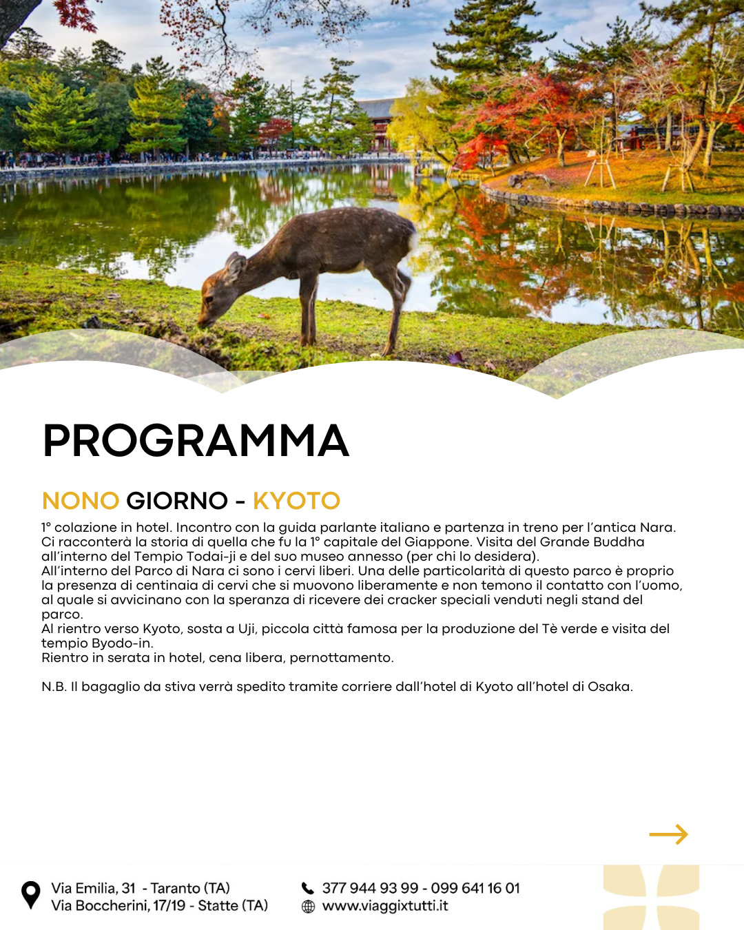 1° colazione in hotel. Incontro con la guida parlante italiano e partenza in treno per l’antica Nara. Ci racconterà la storia di quella che fu la 1° capitale del Giappone. Visita del Grande Buddha all’interno del Tempio Todai-ji e del suo museo annesso (per chi lo desidera). All’interno del Parco di Nara ci sono i cervi liberi. Una delle particolarità di questo parco è proprio la presenza di centinaia di cervi che si muovono liberamente e non temono il contatto con l’uomo, al quale si avvicinano con la speranza di ricevere dei cracker speciali venduti negli stand del parco. Al rientro verso Kyoto, sosta a Uji, piccola città famosa per la produzione del Tè verde e visita del tempio Byodo-in. Rientro in serata in hotel, cena libera, pernottamento. N.B. Il bagaglio da stiva verrà spedito tramite corriere dall’hotel di Kyoto all’hotel di Osaka.