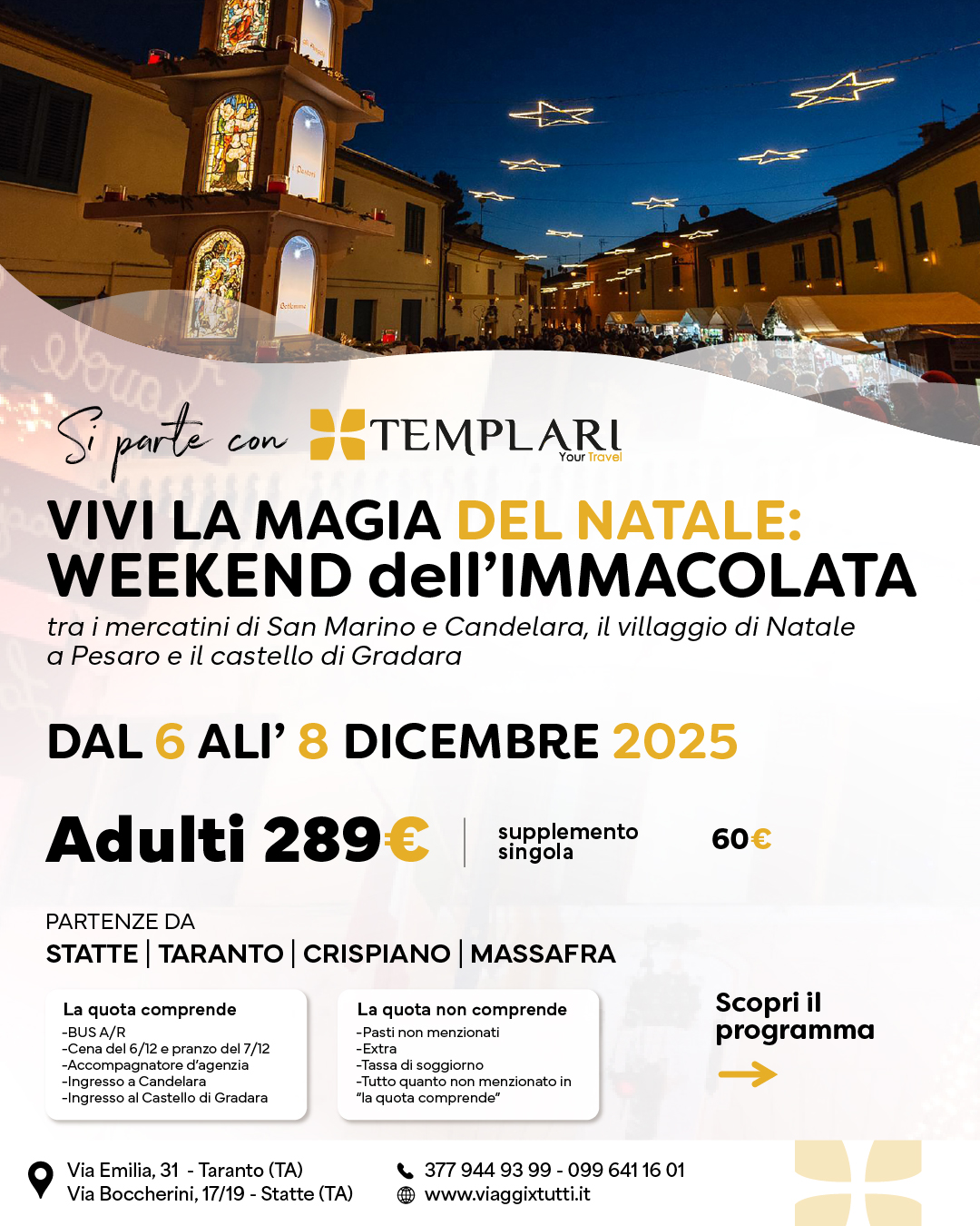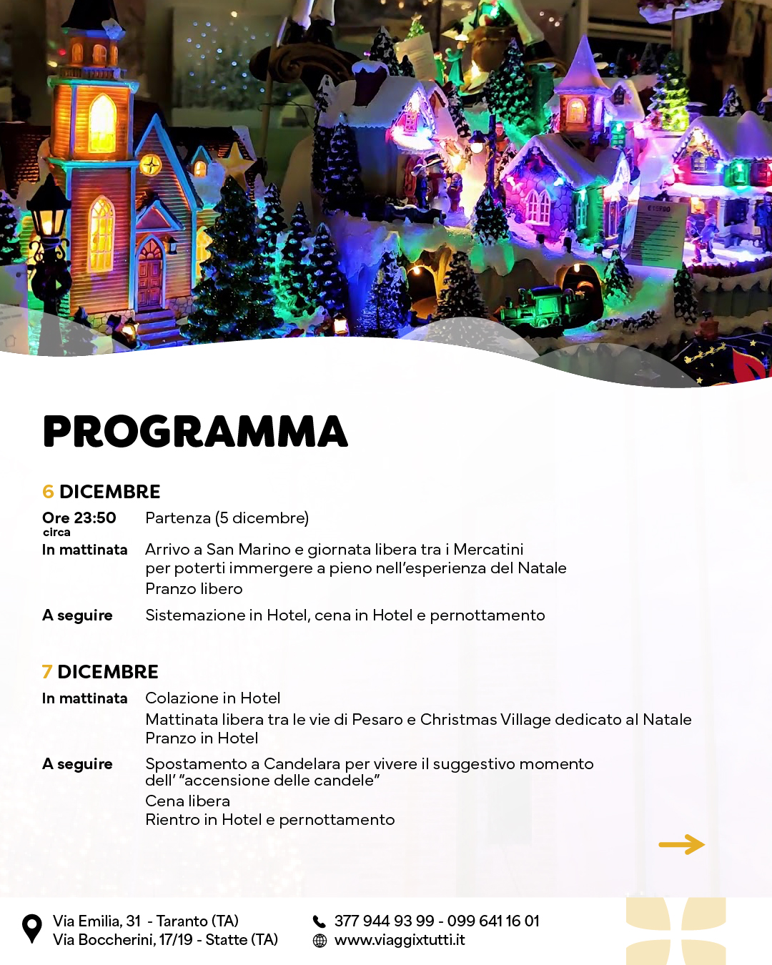 - Arrivo a San Marino e giornata libera tra Mercatini per poterti immergere a pieno nell’esperienza del Natale;