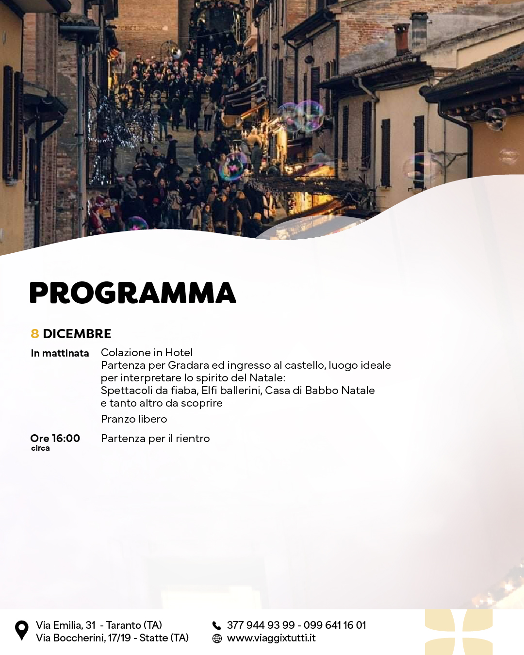 - Partenza per Gradara e ingresso al castello, luogo ideale per intraprendere lo spirito del Natale: spettacoli da fiaba, elfi ballerini, casa di babbo Natale e tanto altro da scoprire;